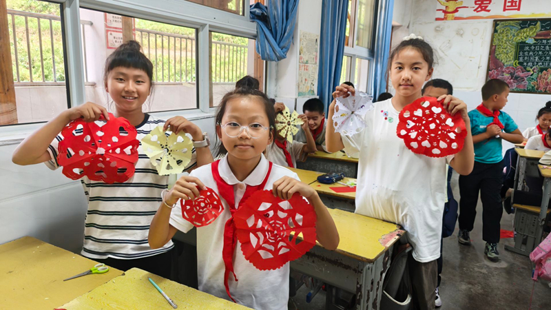 手工创作区热闹非凡,学生通过“童漆绘扇”“妙笔绘盘”“苗族扎染”等活动,亲身体验传统技艺。暑期特色作业展上,剪纸、编织等作品琳琅满目,尽显学生巧思。